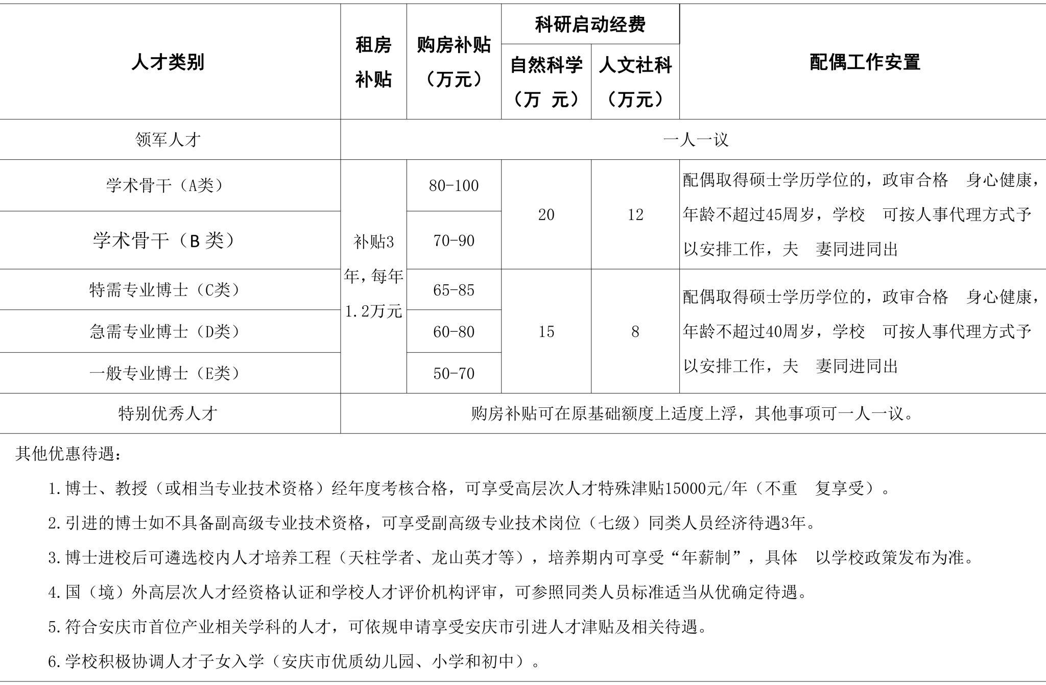引进的全职高层次人才入安徽省事业单位编制,除了享受正常工资福利待遇外,学校还提供购房补贴和科研启动经费等待遇,具体见下表: