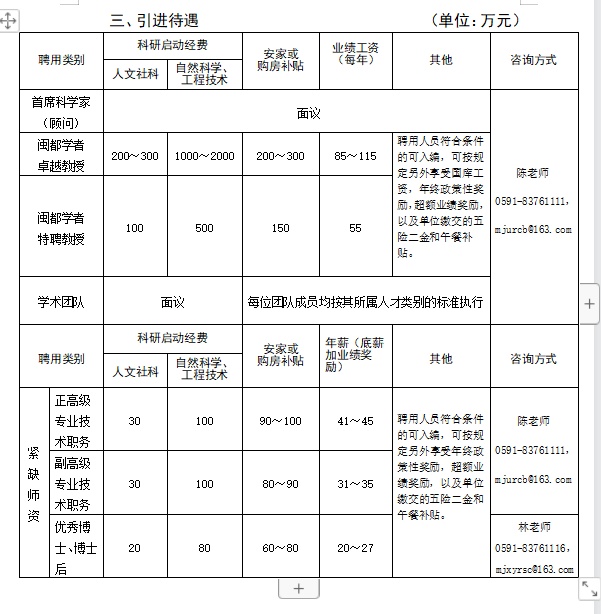 如入选福建省高层次人才,可按规定叠加享受相应待遇及配套支持。具有博士学位或副高级专业技术职务的优秀人才,符合条件者可申请直聘正高。若为学校急需专业人才,经研究可按照“一才一策”、“一事一议”的原则执行。