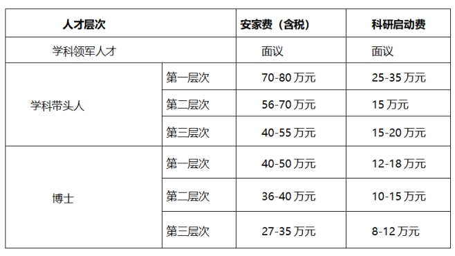 视引进人才业绩拟定,可享受:安家费27-100万元(含税),科研启动费8-35万元,学科领军人才引进待遇可“一事一议”。优秀人才入职后可视个人情况申请20-80万元年薪(含税)。