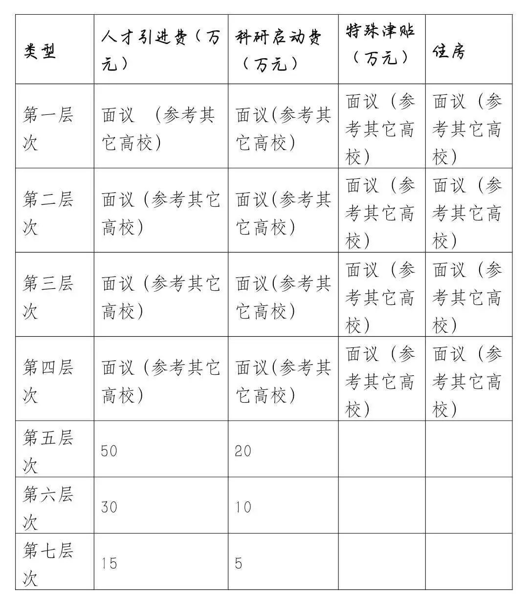 1.学校提供人才引进费、科研启动费、特殊津贴和住房。第一至第四层次人才引进费按照最终签订的协议内容支付,其余层次人才引进费在被引进人才正式入职后一次性支付。