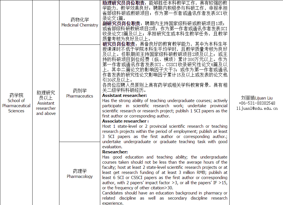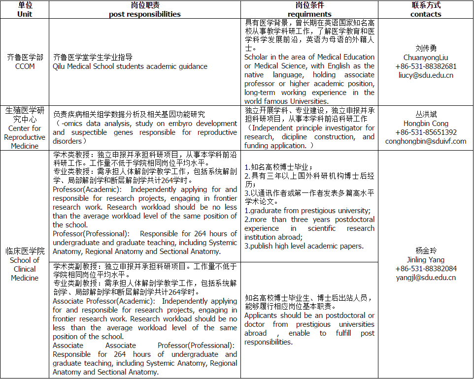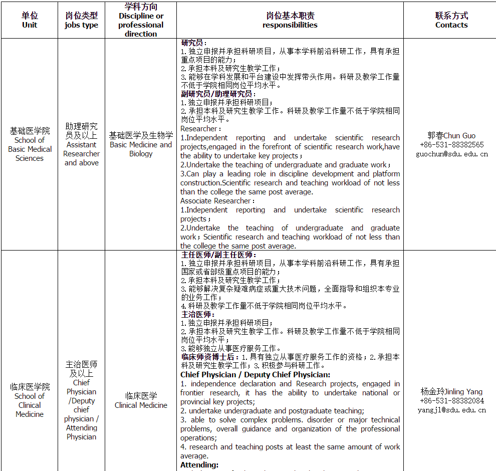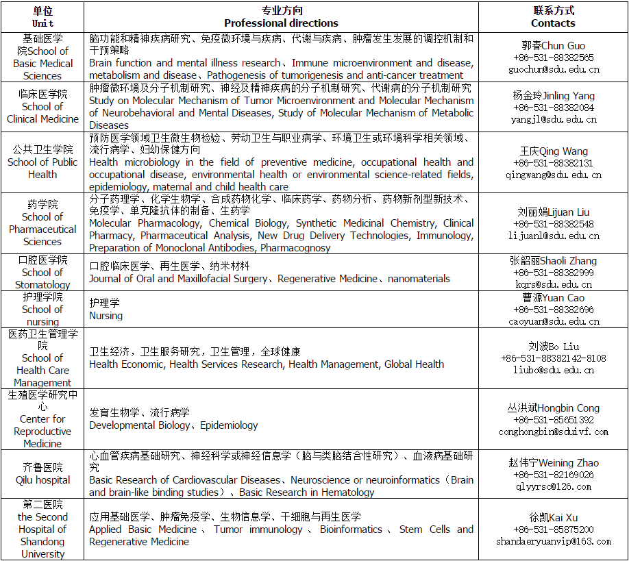 应聘者与对应专业方向的联系人直接联系,同时将应聘材料电子版抄送至山东大学齐鲁医学部人事处yxbzzh@sdu.edu.cn。