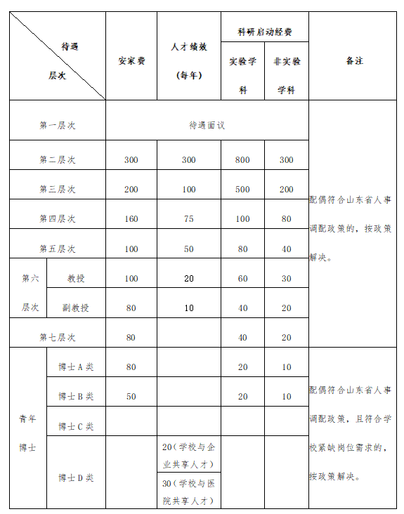 各类引进人才除享受国家及学校规定的基本工资待遇外,学校在安家费、科研启动经费等方面提供如下待遇:(人民币,单位:万元)