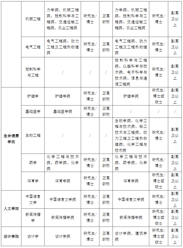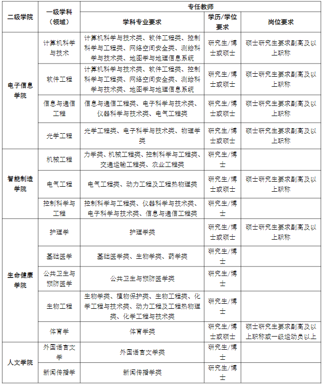 引进各学科专业教学、科研人员共42名,要求博士研究生或硕士研究生(副高及以上职称等)。具体岗位及要求详见下表,如应聘人员有特殊业绩,经学校认可,博士研究生可不受学历学位、职称、学科等条件限制。