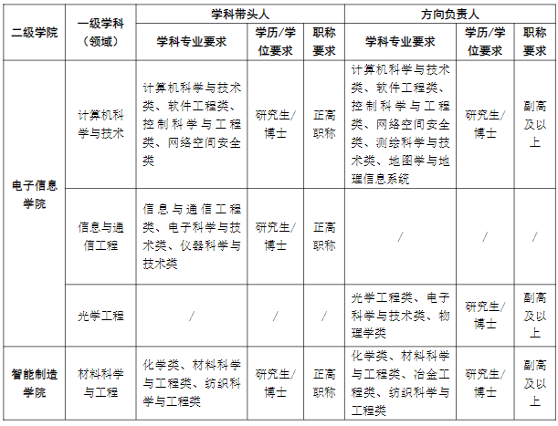 涉及学科:计算机科学与技术、信息与通信工程、光学工程、材料科学与工程、控制科学与工程、机械工程、电气工程、护理学、药学、中国语言文学、新闻传播学、设计学、应用经济学、管理科学与工程、工商管理、马克思主义理论等学科。引进待遇“一人一议”。