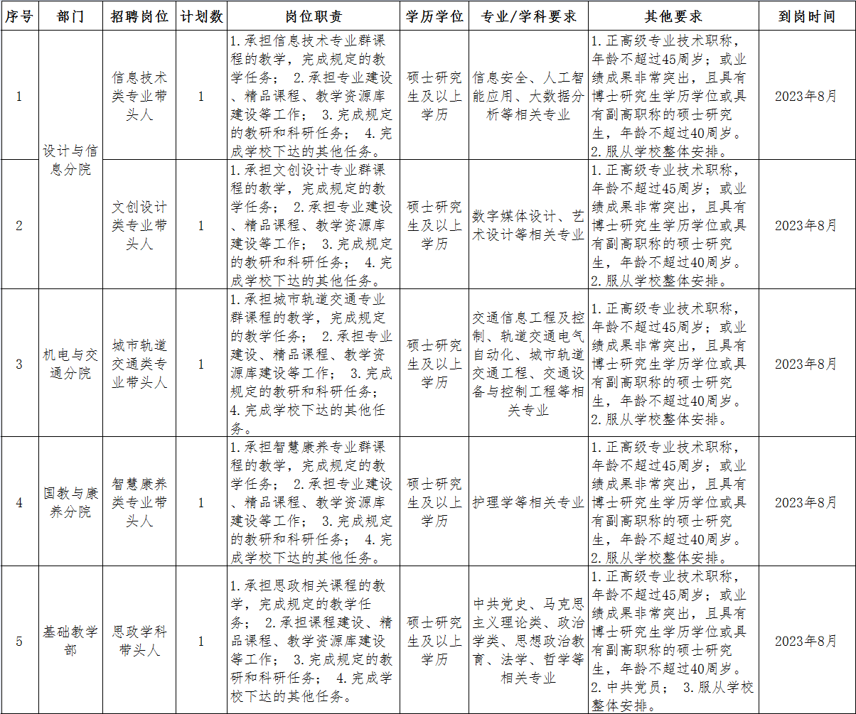 1.以上应聘专业教师岗位(专业带头人除外)人员具有博士研究生学历或副高及以上专业技术职务者优先考虑。